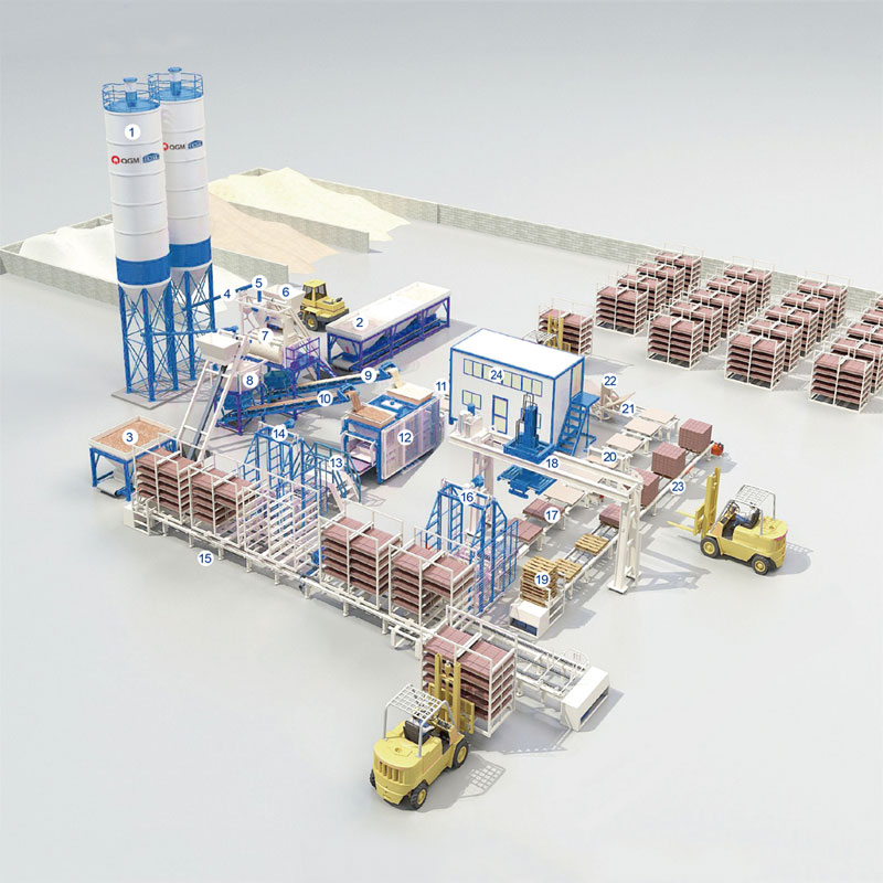 Это полностью автоматизированная производственная линия со стойкой для отверждения стали, оснащенной стойкой для отверждения. Линия включает в себя автоматическую систему взвешивания бетона, бетоносмесительную станцию, автоматическую подачу цемента и другого сырья перед смешиванием, автоматический блок формования полых блоков, подъемное устройство, систему транспортировки влажных блоков и блоков отверждения, автоматическое устройство штабелирования, система восстановления поддонов и система упаковки для блоков отверждения. Для эксплуатации этой линии требуется всего 5 сотрудников, которые могут производить такую продукцию, как бетонные блоки, пустотелые строительные блоки, бетонный кирпич и брусчатка.